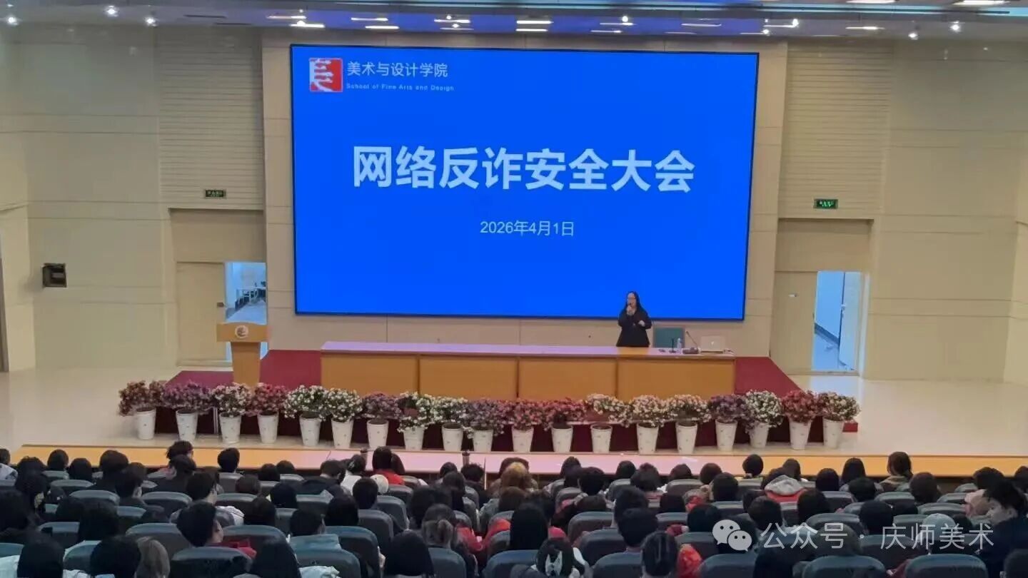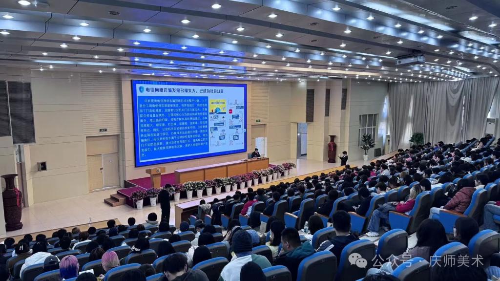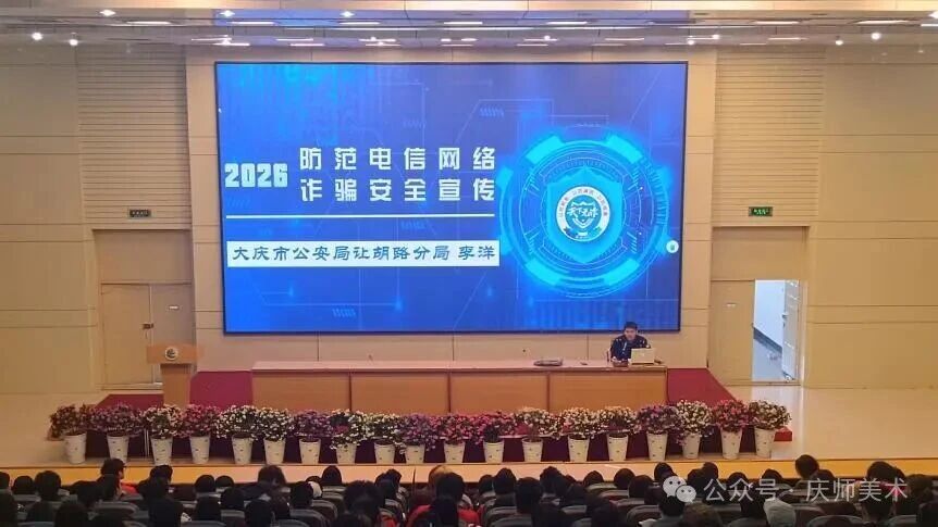 为切实提升美术与设计学院全体学生的电信网络诈骗防范意识,有效遏制校园涉诈案件发生,筑牢校园安全防护屏障,2026年4月1日,美术与设计学院在综合主楼铁人讲堂召开网络反诈安全大会,特邀大庆市公安局让胡路分局社区一队李洋警官,为学院全体学生开展防范电信网络诈骗专题宣传教育。