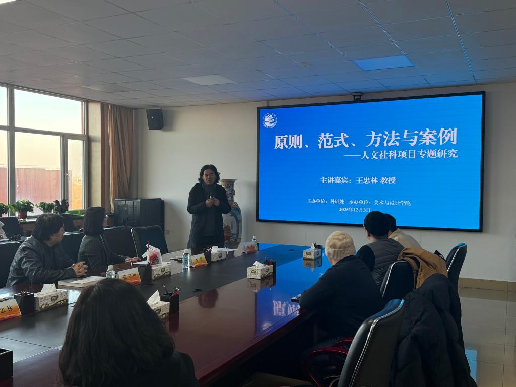 为进一步做好2026年度高层次科研项目申报工作,加强文科学院科研管理,切实提高项目申报书的质量,提高项目申报立项率,12月3日下午,由学校科研处主办,美术与设计学院承办的《原则、范式、方法与案例——人文社科项目专题研究》学术讲座,在学校主楼633会议室举行,特邀请盐城师范学院美术与设计学院院长、博士生导师王忠林教授主讲。科研处处长张晓梅、副处长孙明明、美术与设计学院党总支书记、院长张立翔及学院文科学院教师代表、美术与设计学院全体教师参加学术讲座,讲座由美术与设计学院副院长李慧主持。
