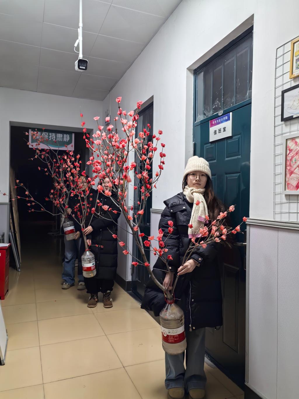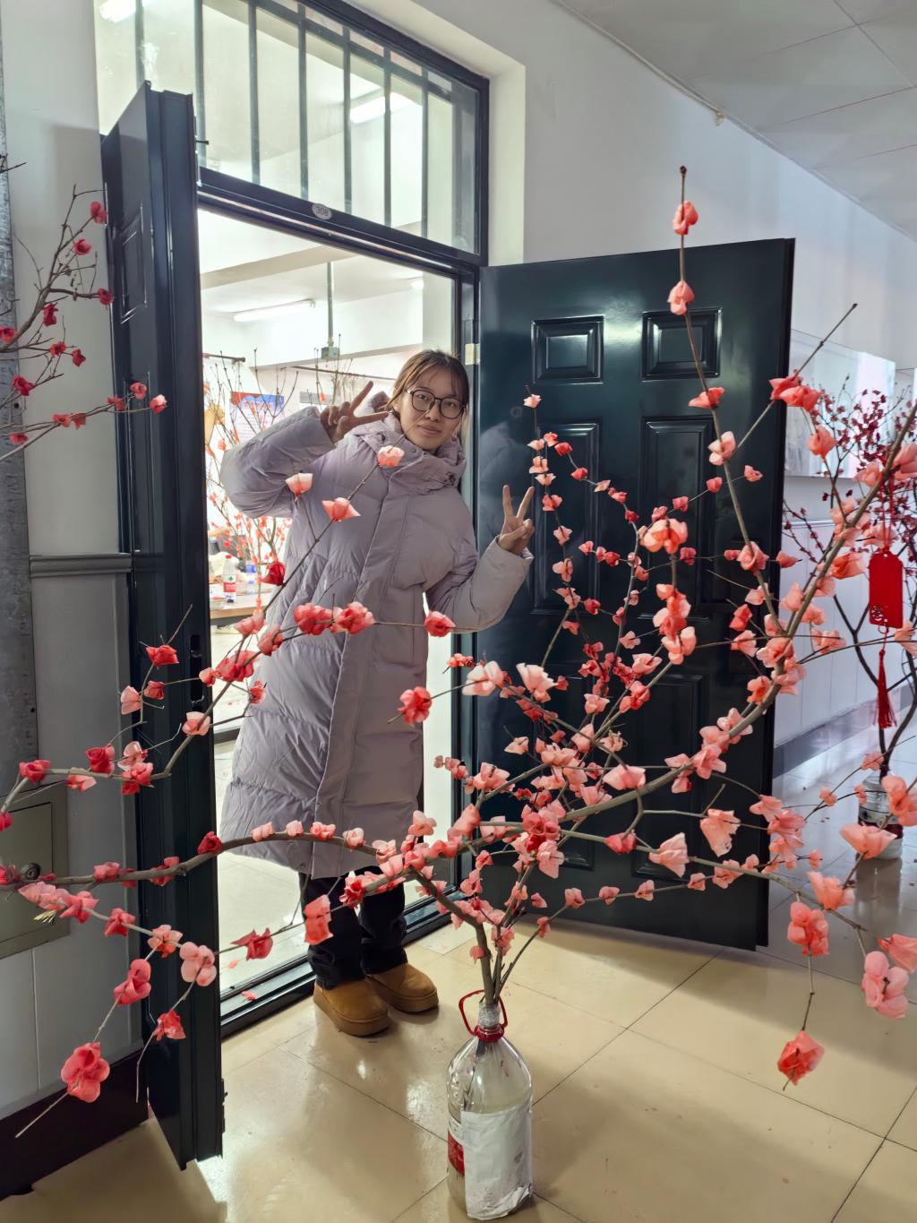 创作接近尾声,大家纷纷捧着自己的得意之作,在活动现场的打卡点合影留念。镜头前,同学们或手举腊梅与老师并肩而立,或三五成群让花枝与笑脸同框,一张张照片定格了手工创作的成就感,也留存下师生共度的温馨时光。
