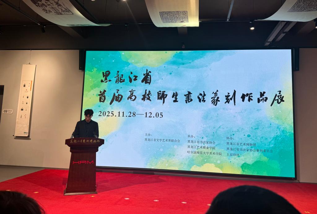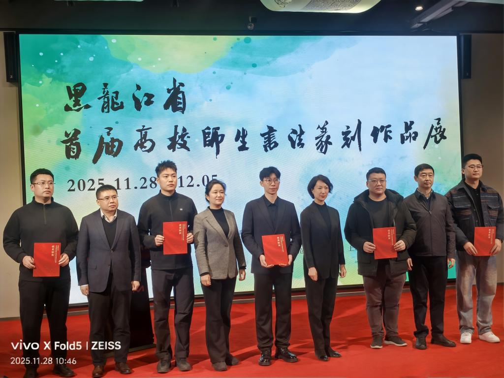 11月28日,黑龙江省首届高校师生书法篆刻作品展在黑龙江省艺术博物馆隆重开幕。我院青年教师闫留学在本次赛事中斩获教师组金奖,并作为教师代表在开幕式上发表获奖感言,彰显了我校书法教育的扎实成效与青年教师的专业风采。